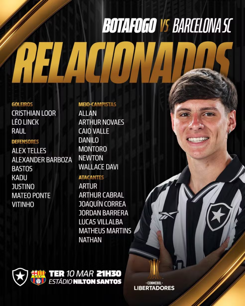 O Botafogo divulgou, no início da tarde desta terça-feira, a lista de relacionados para enfrentar o Barcelona-EQU pelo jogo de volta da 3ª fase da Libertadores. A novidade é o retorno de Allan ao time.