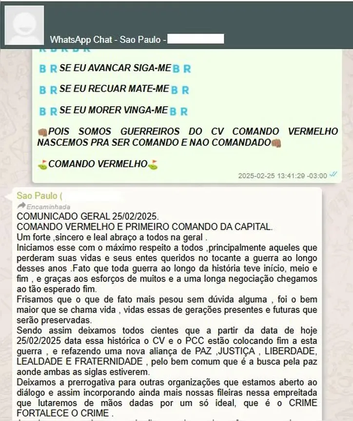 Entre os arquivos encontrados, um documento intitulado “Comunicado Geral”, datado de 25 de fevereiro de 2025, comunica aos gerentes das duas organizações que foi firmada “uma nova aliança de paz, justiça, liberdade, lealdade e fraternidade” entre o CV e o PCC.
