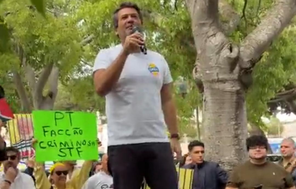 Entre as faixas levantadas durante o ato, estavam mensagens como “PT facção criminosa” e referências ao STF, em um protesto que reuniu apoiadores da direita portuguesa e brasileiros residentes no país.